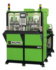 O modelo Iris é uma injetora estática excelente para a produção de solados mono ou bicolor em materiais termoplásticos compactos ou expandidos, com ou sem insertos, fachetes, viras, solas de couro, etc.