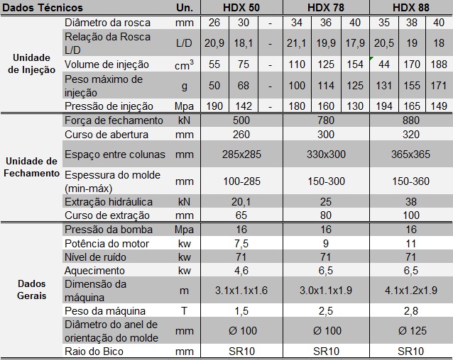 As injetoras horizontais para termoplástico da linha HDX tem capacidade de força de fechamento entre 50 a 3300 toneladas, com diversas configurações para melhor adequação às necessidades de produção. Busca-se a utilização de peças e componentes padronizados facilmente encontrados em nosso comércio local, facilitando a distribuição, comercialização e assistência técnica, exclusivamente realizadas pela Sulpol.
